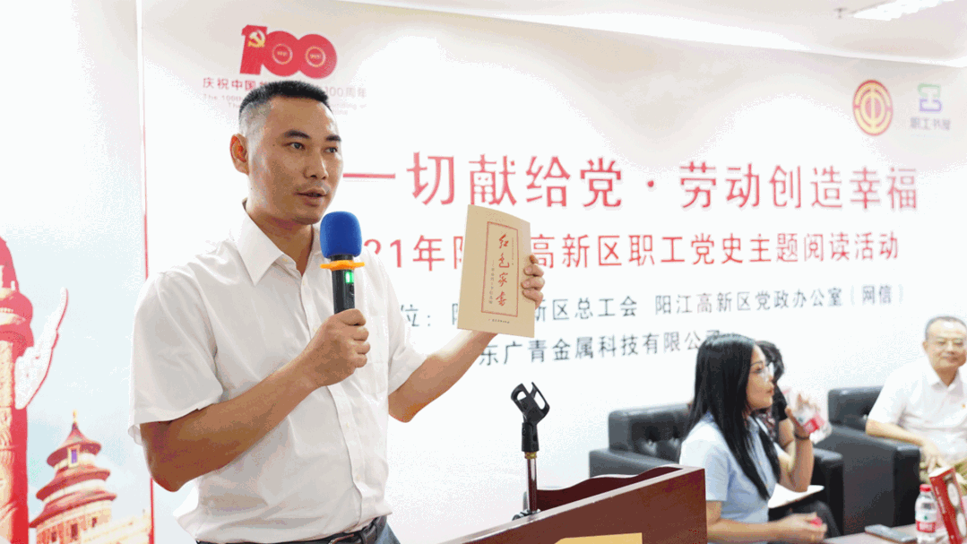 6月29日,由阳江高新区总工会、区党政办(网信)和广东广青金属科技有限公司工会联合举办的“把一切献给党•劳动创造幸福”阳江高新区职工党史主题阅读分享会在广青科技职工书屋举行,阳江高新区总工会主席阮广渊,公司党委副书记、工会主席王大庆以及职工代表参加了活动。