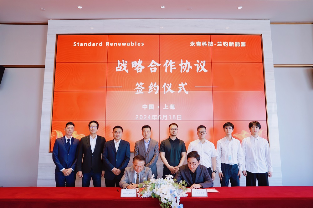 6月18日下午,永青科技集团有限公司旗下兰钧新能源科技有限公司与Standard Renewables(斯丹德新能源有限公司)在jinnianhui今年会实业大楼举行战略合作签约仪式。永青科技集团副总裁、兰钧新能源董事长冯挺与Standard Renewables创始人& CEO柯宏霖代表双方签署战略合作协议。